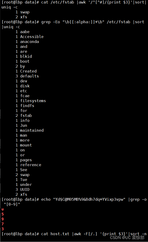 - [root@localhost ky15]#grep -Eo "\b[[:alpha:]]+\b" /etc/fstab |sort |uniq -c