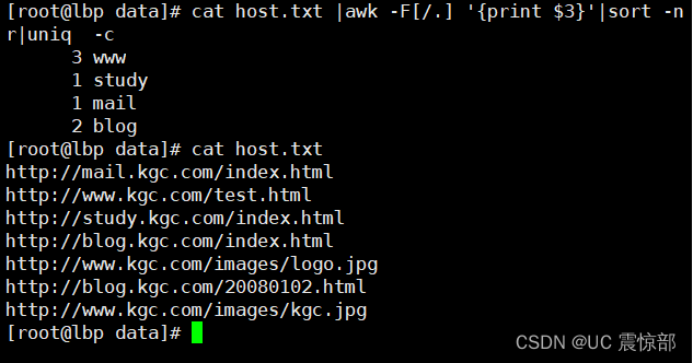 - [root@localhost ky15]#cat host.txt |awk -F[/.] '{print $3}'|sort -nr|uniq -c