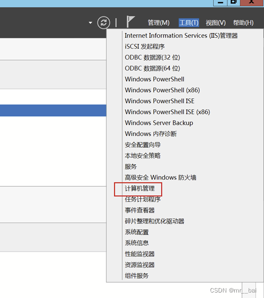 8、 返回到服务器管理器,点击右上角工具选择IIS