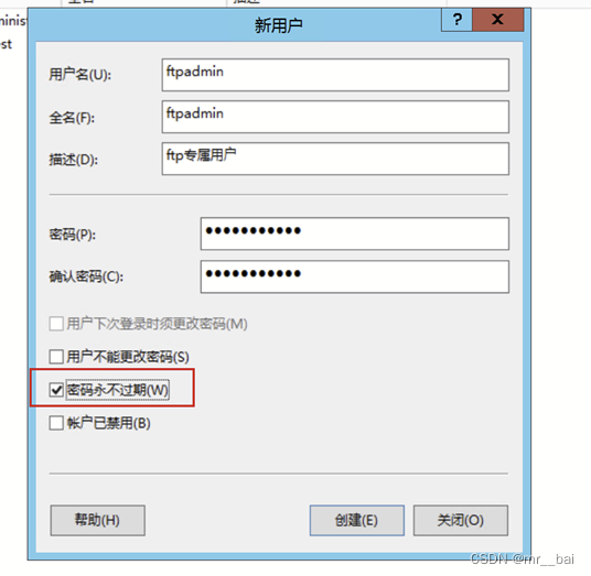 3、填写用户名及密码,并且选择密码永不过期。(可根据自己需要选择,默认的为第一个)