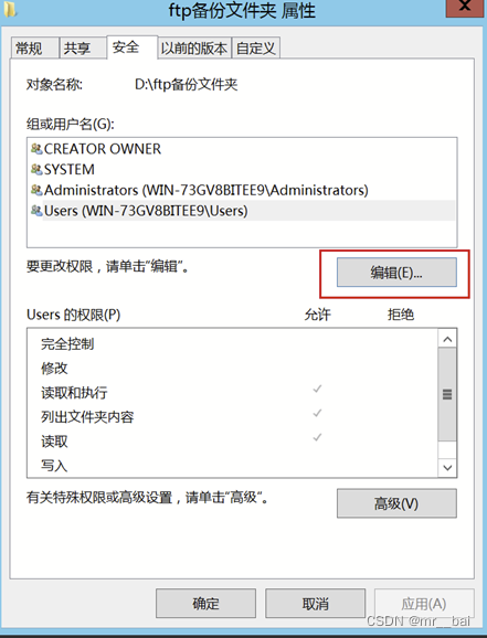 3、 因为ftp隶属于users组,所以选中users并且勾选完全控制并点击应用