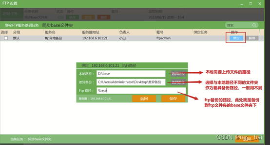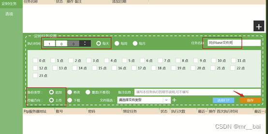 5、 我这里,任务名称为‘同步base文件夹夹’,定时任务为:每天凌晨1点钟从本地文件夹同步至ftp文件夹,备份方式为追加。点击保存