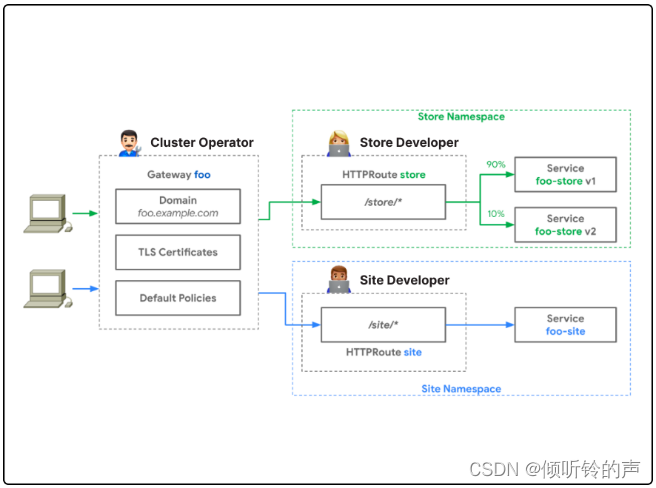 在新的 Gateway API 中,Gateway API 将这些和其他配置解耦为 Gateway 和 Route 对象,允许应用程序工程师和 Devops 工程师/集群操作员自由安全地行动,如下所示:
