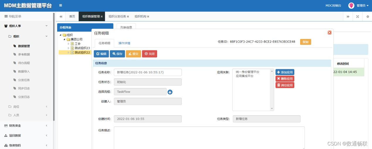 2.数据管理:对组织、人员、岗位、客户等基础信息的管理,包括基础数据的关联,发起流程,再次分发等功能。每类主数据都有各自的参考数据,对比如民族、地区、学位等常用而又比较复杂的元数据进行管理;