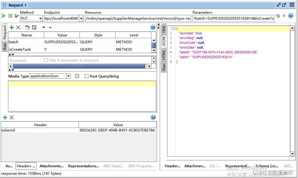 需要请求头中添加全局变量的tokenId(注意tokenId是否过期),同时注意入参格式,还需要添加批次和isCreateTask否则调用不通。
