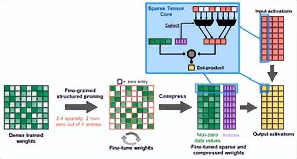 Nvidia的A100 GPU采用了类似于平衡性稀疏的方法,支持每个行上2:4的结构化稀疏性,即允许每4个输入向量中有两个非0值,它可以被有效地压缩并将内存存储和带宽减少近 2 倍。