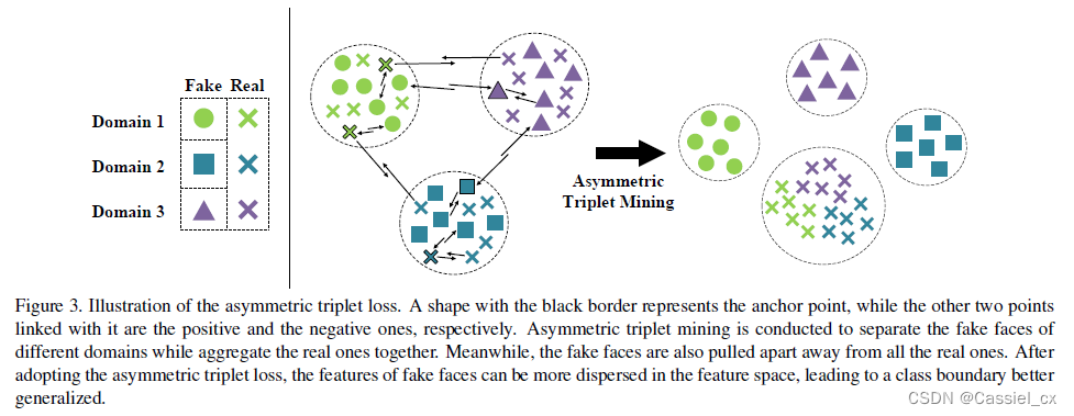 由于攻击类型以及数据收集方式的多样性,假人脸数据分布的差异性远大于真人脸的差异性,因此为假人脸寻找一个分散的特征空间比寻找一个紧凑的特征空间简单。作者明确地分离了来自不同域的假人脸,以迫使它们在特征空间中更加分散。为了实现真假人脸的非对称优化目标,作者提出了非对称三元组损失来根据类别进行非对称三元组挖掘,这有助于为未知域学习更好的类边界。具体来说,假设有3个源域,将来自三个不领域的真假人脸重组并分成四类,如下图左边所示,三个不同域的假人脸被视为不同的类别 (分别为圆形、正方形和三角形),而所有真人脸被归为一个类别(叉)。接着,对真假人脸进行四类非对称三元组挖掘,达到以下优化目标:1)分离不同域的假人脸; 2)聚合所有源域的真人脸; 3)将真假人脸分开。之后,如下图右边所示,提取的假人脸特征在特征空间中比以前更加分散,而真人脸的特征则更加聚合,从而为未知域提供了更好的泛化类边界。特征生成器优化如下:
