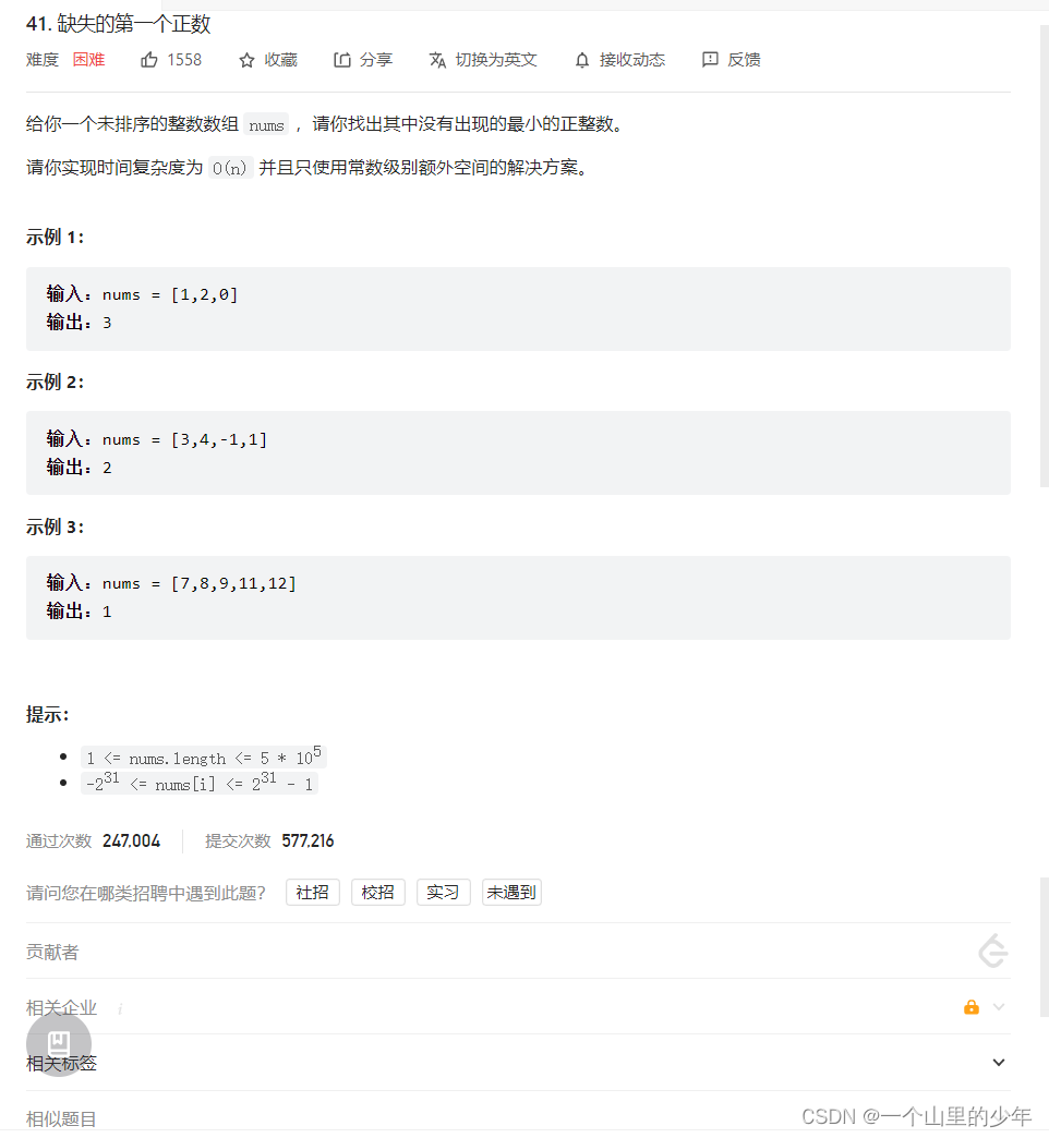 本题的思路和前面两题的思路也是一样的,我们希望将数组当中的每个位置调整成nums[i]=i+1这样的形式,但是这个本题可能有负数并且数组可能超过了数组的长度这该如何了,如果我们发现某个位置的数值小于0或者大于了数值的长度这个位置的数字我们不做任何处理,对于一个位置上的数nums[i]他应该去的位置是nums[i]-1,所以我们只需要判断每个位置的i对于nums[i]==nums[nums[i]-1]是否成立如果成立说明本来就在正确的位置上我们不需要进行调整,如果发现不满足条件那么我们只需要将nums[i]位置和nums[nums[i]-1]位置的数进行交互,继续重复上面的步骤直到不满足条件或者到了正确的位置