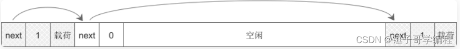 另外,由于单向链表只能向一个方向搜索,在合并或拆分内存块时不方便,所以大部分 malloc() 实现都会在内存块中增加一个 pre 指针指向上一个内存块,构成双向链表,如下图所示: