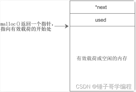 内存块(包括已分配和空闲的)的结构类似于链表,它们之间通过指针连接在一起。在实际应用中,一个内存块的结构如下图所示:
