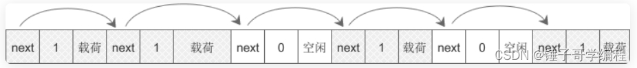 next 是指针,指向下一个内存块,used 用来表示当前内存块是否已被使用。这样,整个堆区就会形成如下图所示的链表: