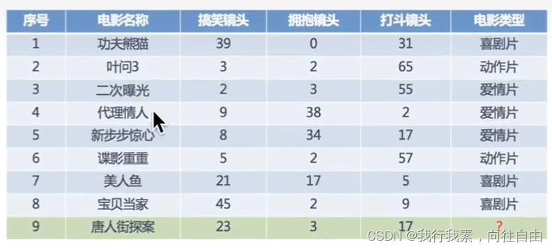 其中?号电影不知道类别,如何去预测?我们可以利用KNN算法的思想:
