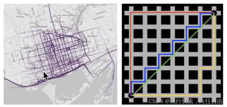 在曼哈顿街区要从一个十字路口开车到另一个十字路口,驾驶距离显然不是两点间的直线距离。这个实际驾驶距离就是“曼哈顿距离”。曼哈顿距离也称为“城市街区距离"(City Block distance)。