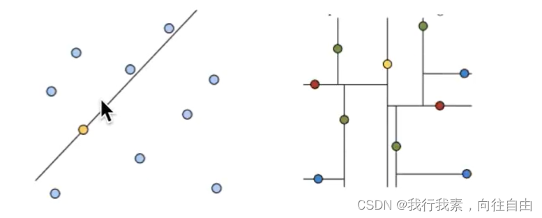 黄色的点作为根节点,上面的点归左子树,下面的点归右子树,接下来再不断地划分,分割的那条线叫做分割超平面(splitting hyperplane) ,在一维中是一个点,二维中是线,三维的是面。