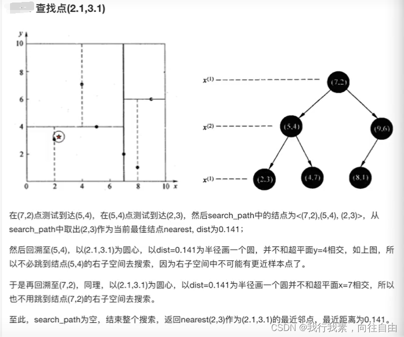 (2)通过递归的方法,不断地对k维空间进行切分,生成子结点。在超矩形区域上选择一个坐标轴和在此坐标轴上的一个切分点,确定一个超平面,这个超平面通过选定的切分点并垂直于选定的坐标轴,将当前超矩形区域切分为左右两个子区域(子结点);这时,实例被分到两个子区域。