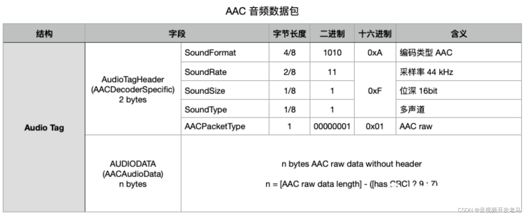 通常在 AudioTagHeader 后面跟着就是 AUDIODATA 数据了,但是对于 AAC 格式的音频数据来说,AudioTagHeader 会多一个字段 AACPacketType 来表示 AACAUDIODATA 的类型:如果 AACPacketType 为 0,那么数据对应的是 AudioSpecificConfig;如果 AACPacketType 为 1,那么数据对应的为 Raw AAC frame data。