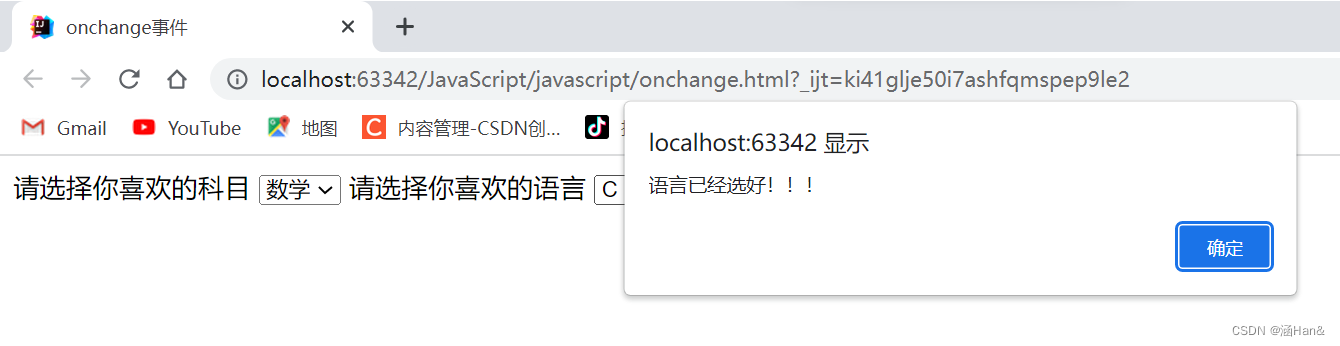 onchange 内容发送改变事件:常用于下拉列表和输入框内容发生改变后操作