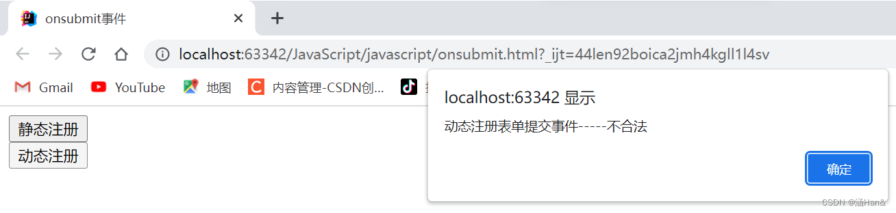 onsubmit 表单提交事件:常用于表单提交前,验证所有表单相是否合法