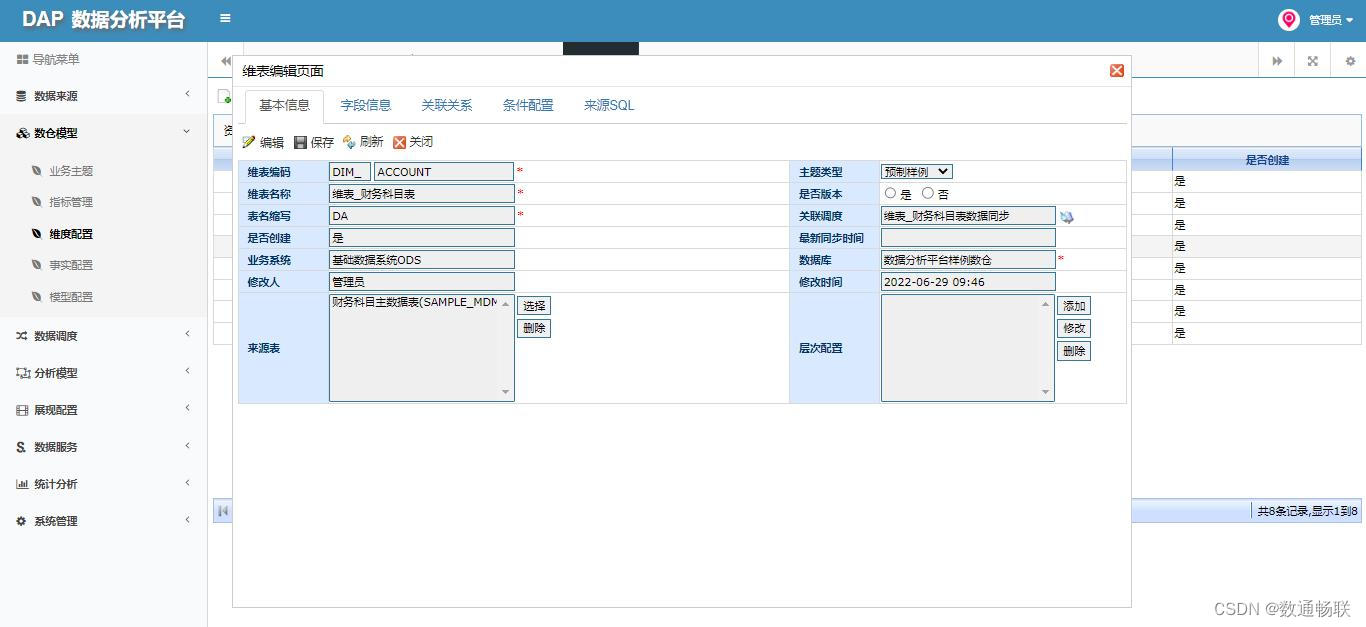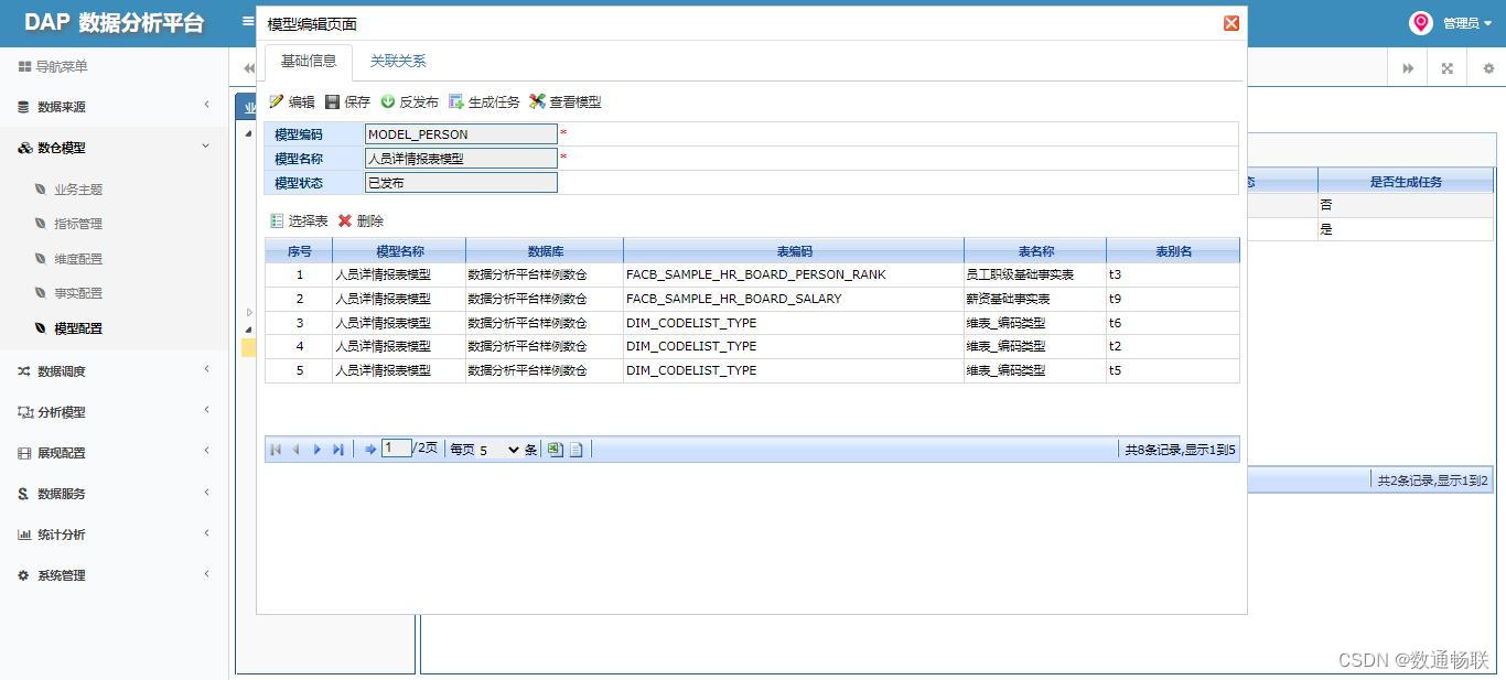 数据分析平台分为两大类,一类是数据模型,另一类为分析模型,数据模型主要包含维表的配置、事实表的配置及模型的配置,并对指标进行集中管控,具体操作步骤如下。