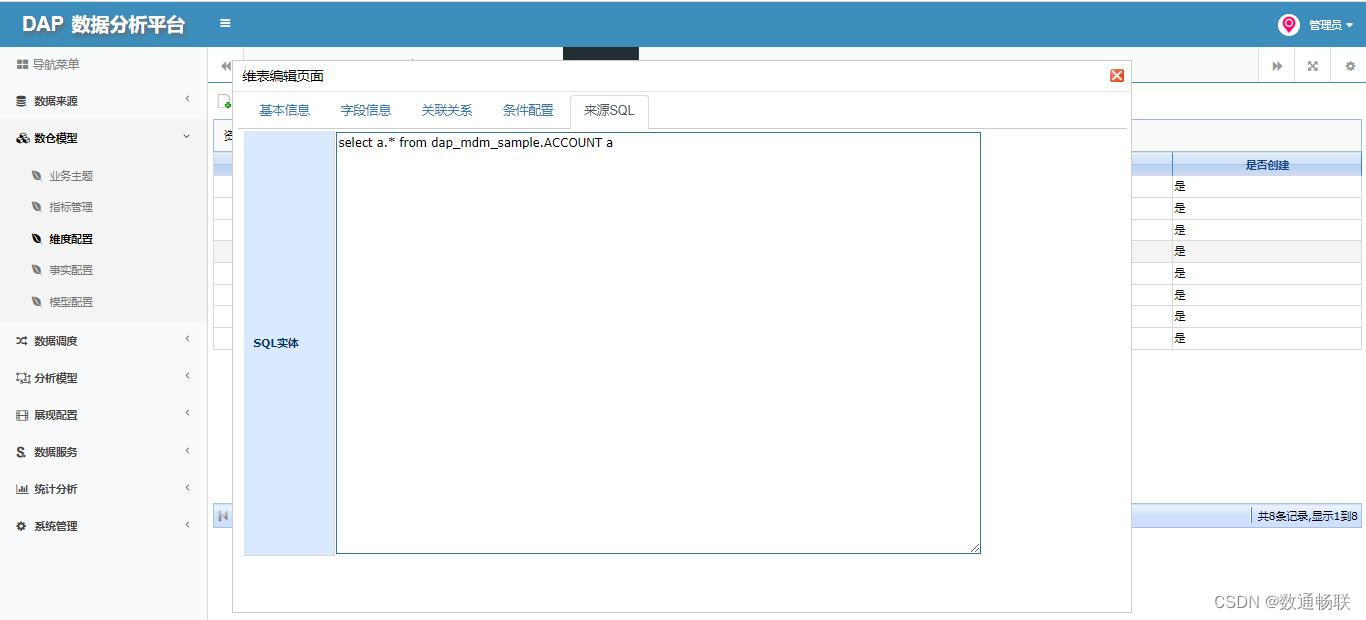 配置维表数据来源的SQL,可以从ODS中撰写SQL定义,也可以通过业务系统定义。