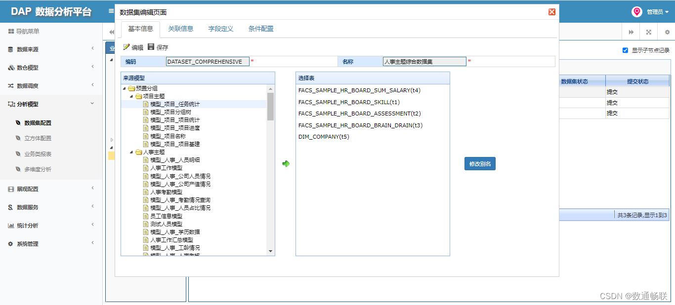 数据分析平台分为两大类,一类是数据模型,另一类为分析模型,分析模型主要包括数据集以及立方体,数据集是基于上述配置数据模型构建的数据集合,在数据集合的基础上还可以进行数据的多维度分析,同时数据集以及立方体可以生成对应的数据服务,可以为供第三方系统提供数据汇总服务,现对配置过程描述如下。