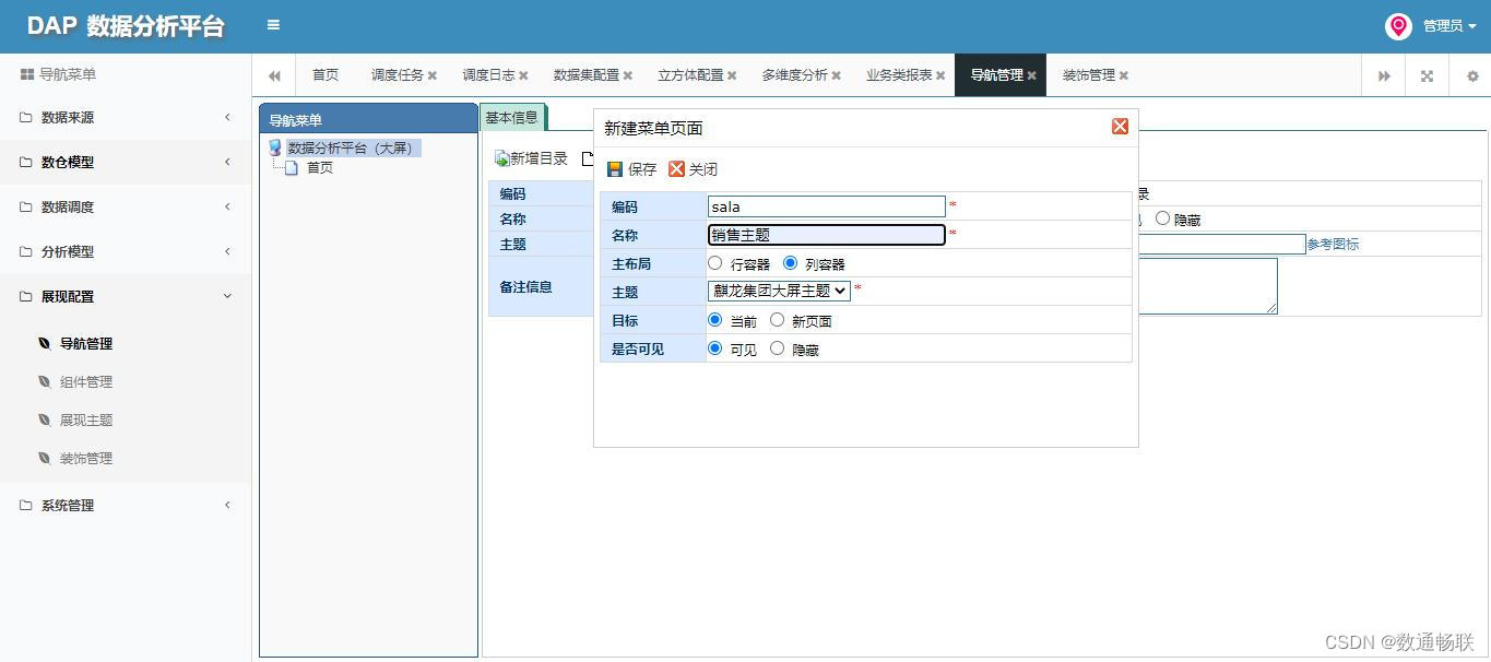在进行数据分析前我们需要对分析的主题进行划分,通常来说企业常见的主题包括人事主题、财务主题、销售主题、生产主题、采购主题、成本主题以及各个行业领域的专属主题等等,在DAP数据分析平台划分的业务主题通常是跨业务系统。