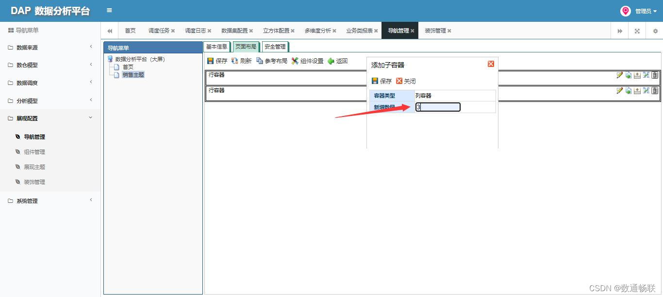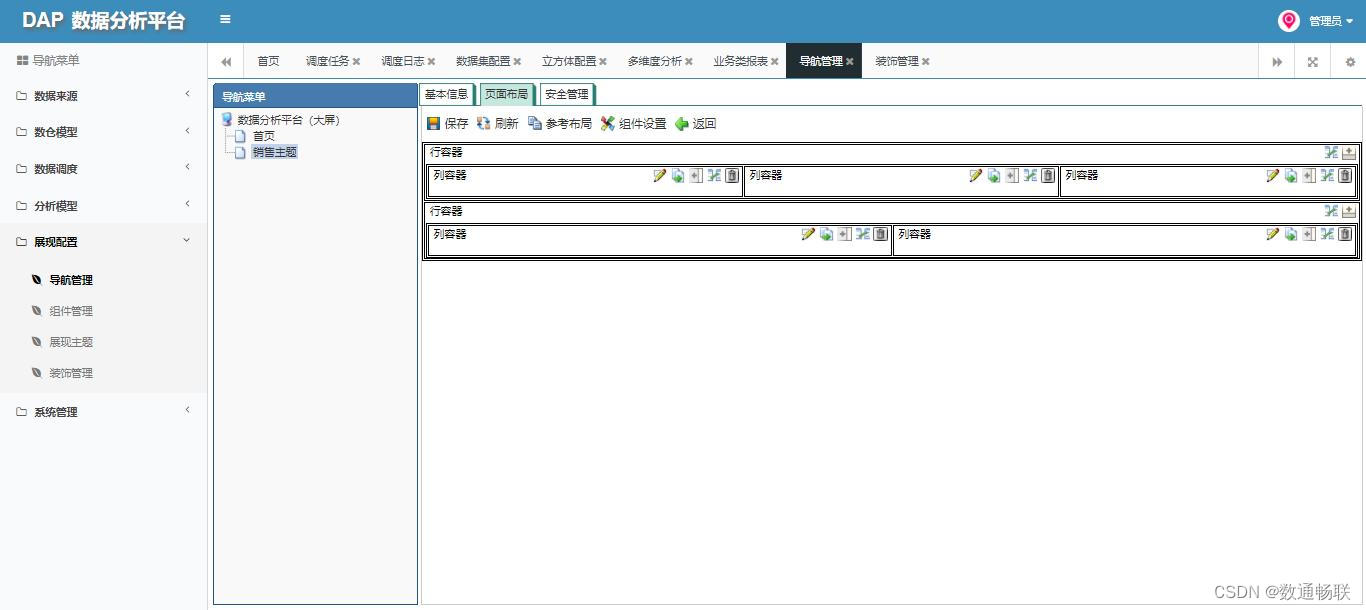 页面布局主要针对组件的展示位置进行样式配置,首先在导航管理处新增一个页面,在页面进行布局。