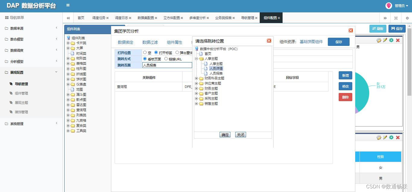 8.配置数据大屏、分析主题,并配置组件之间的联动、穿透,穿透包含三种穿透方式。