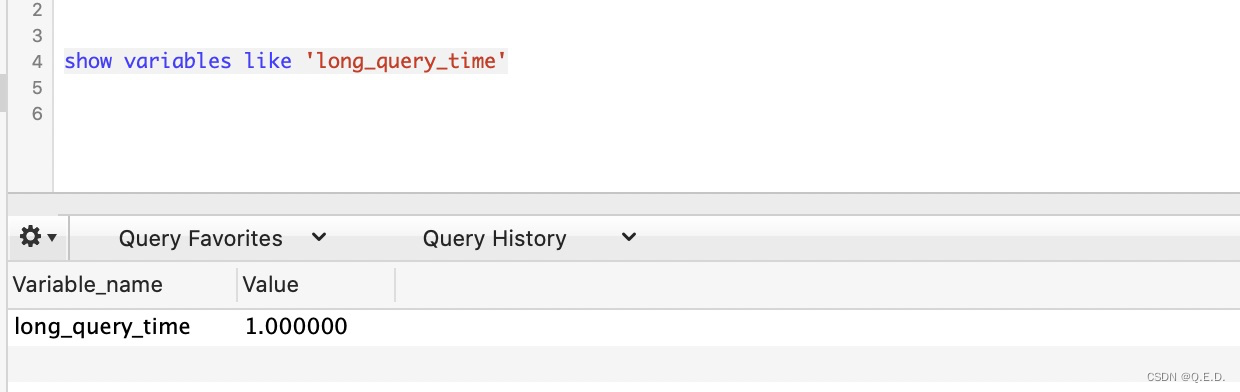 这个 long_query_time 是用来定义慢于多少秒的才算 “慢查询”,注意单位是秒,我通过执行 sql 指令 set long_query_time=1 来设置了 long_query_time 的值为 1, 也就是执行时间超过 1 秒的都算慢查询,如下:
