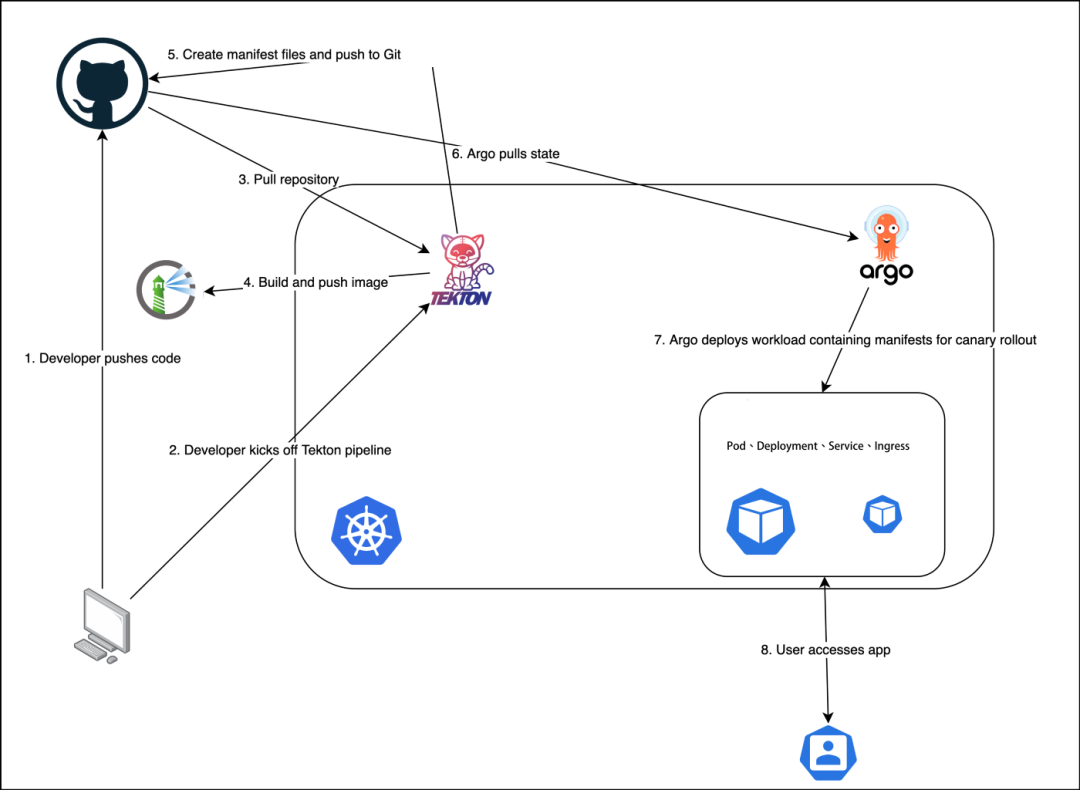 最后用一张图来总结下我们使用 Tekton 结合 Argo CD 来实现 GitOps 的工作流: