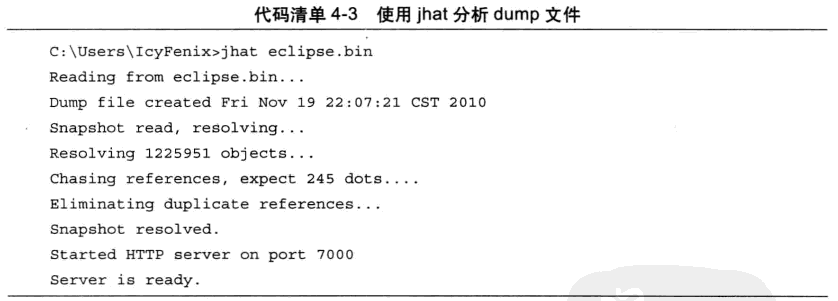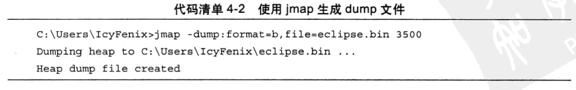 代码清单4-2是使用jmap生成一个正在运行的Eclipse的dump快照文件的例子, 例子中的3500是通过jps命令査询到的LVMID.