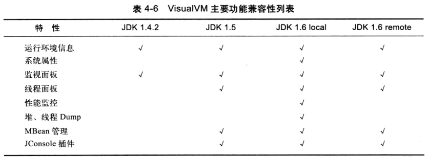 VisualVM在JDK 1.6 update 7中才首次出现,但并不意味着它只能监控运行于JDK 1.6上的程序,它具备很强的向下兼容能力,甚至能向下兼容至近10年前发布的JDK 1.4.2平台气这对无数已经处于实施、维护状态的项目很有意义。当然,并非所有的功 能都能完美地向下兼容,主要特性的兼容性如表4-6所示。