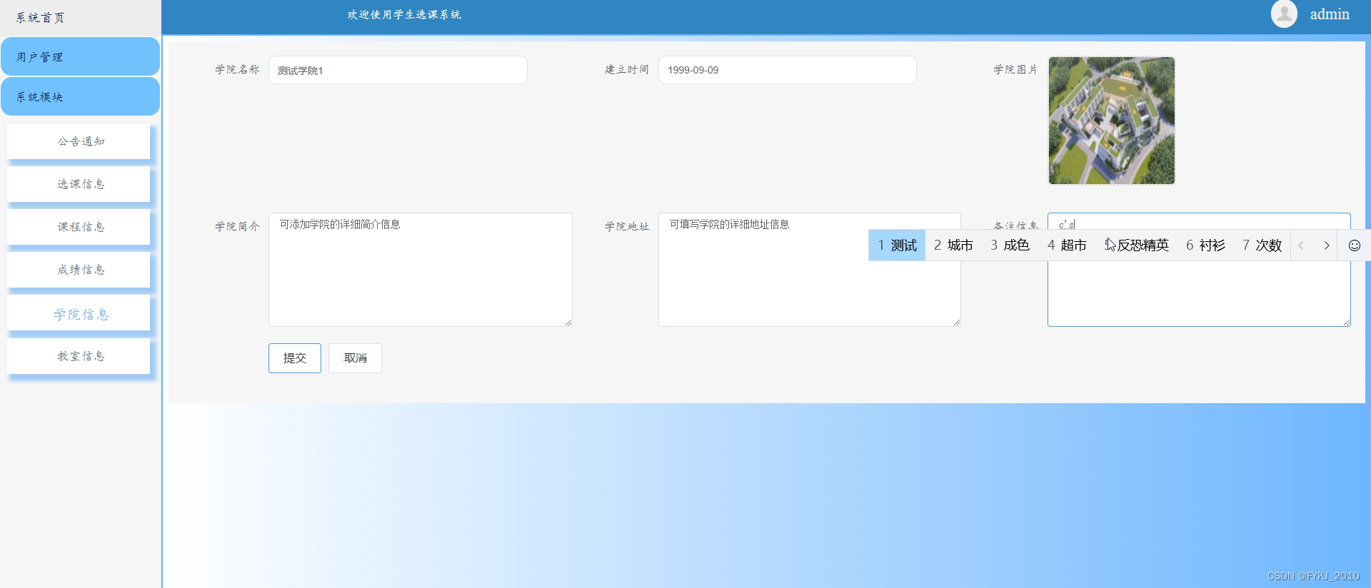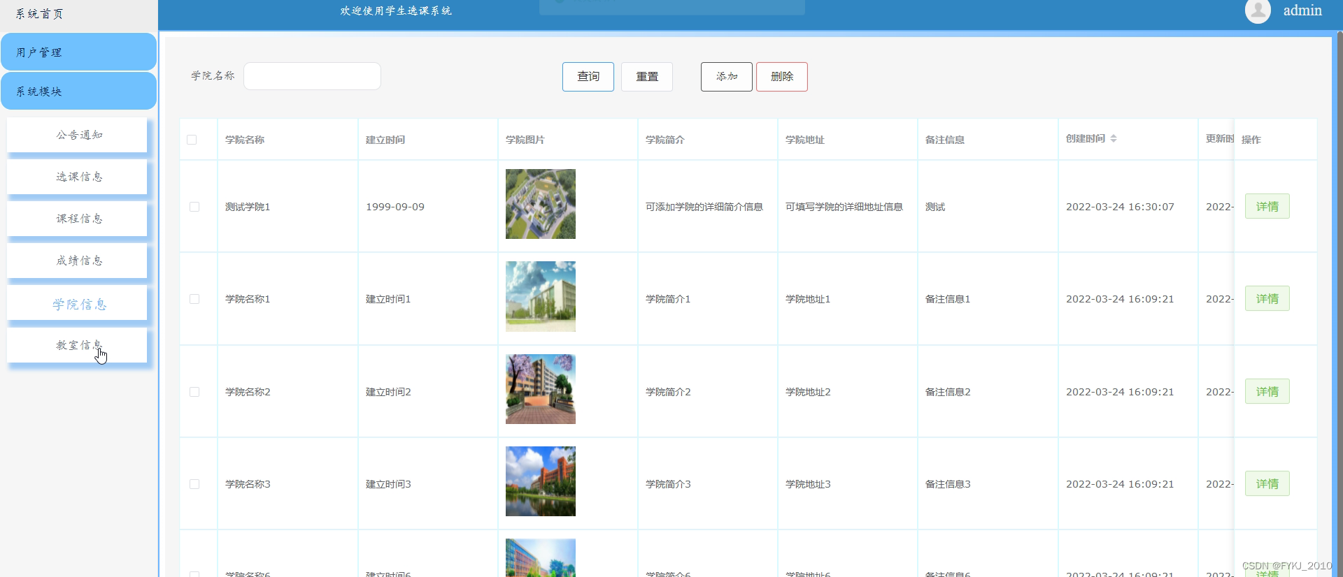 学院信息功能主要指对其学院名称、学院简介、学院地址、学院图片等一些基本信息的添加、删除和修改。