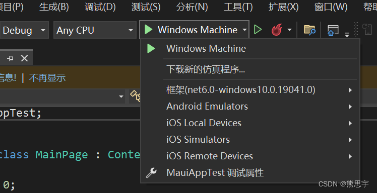 注意这里 ,运行程序的时候,要点击 Windows Machine ,而不要点击右边的运行图标
