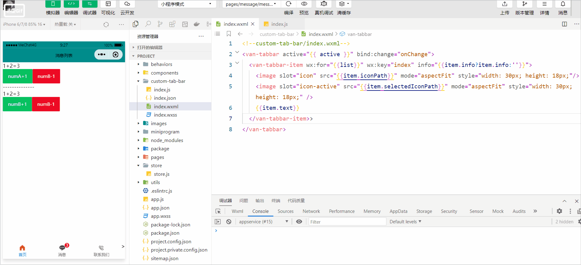我们将active引入到store实例对象当中,来动态的获取页面的索引值;在我们进行自定义tabBar的时候切换页面可能会出现闪烁问题,可自行百度,这里仅以举例为主。
