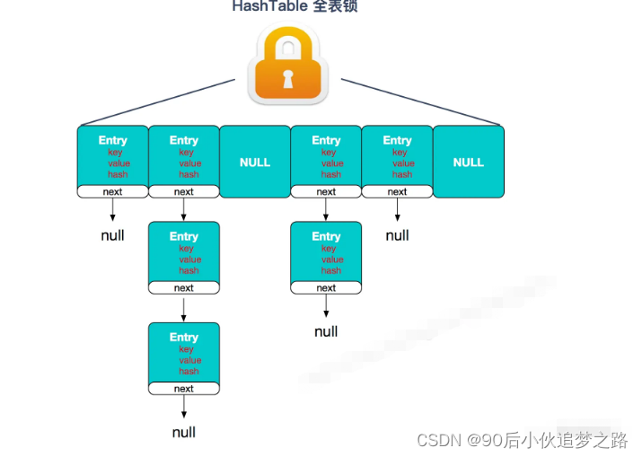 - ② Hashtable(同一把锁) :使用 synchronized 来保证线程安全,效率非常低下。当一个线程访问同步方法时,其他线程也访问同步方法,可能会进入阻塞或轮询状态,如使用 put 添加元素,另一个线程不能使用 put 添加元素,也不能使用 get,竞争会越来越激烈效率越低。