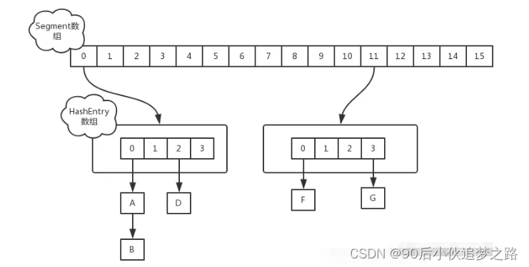 一个 ConcurrentHashMap 里包含一个 Segment 数组。Segment 的结构和HashMap类似,是一种数组和链表结构,一个 Segment 包含一个 HashEntry 数组,每个 HashEntry 是一个链表结构的元素,每个 Segment 守护着一个HashEntry数组里的元素,当对 HashEntry 数组的数据进行修改时,必须首先获得对应的 Segment的锁。