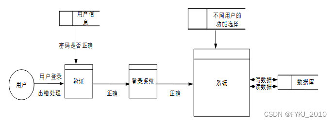 系统顶层数据流:外部实体为用户,第一个流程为登录验证,用户信息表返回密码验证,是否正确,正确则登录系统,错误则反馈信息,登录系统后,根据不同用户的功能选择,来读写数据库。