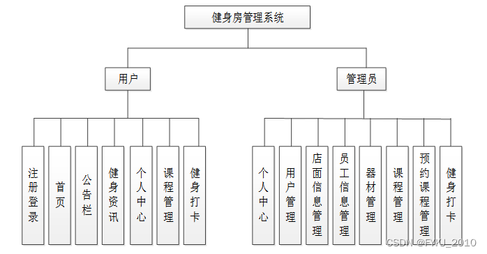 根据用户对系统的需求,要求系统简单操作,能够准确,完整的对信息进行管理。健身房管理系统在对需求做解析后,整个系统主要分为两个部分:管理员和普通用户,每个模块下的分支功能不一样。对功能做出如下说明: