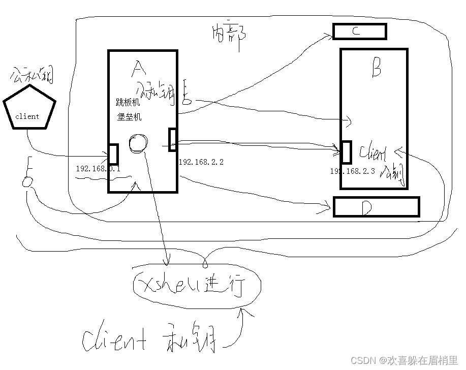 客户端将私钥交给xshell管理,跳到A到时直接调动xshell,A然后登录到B上面时直接输入客户端的公钥,A上面就不需要生成公私钥。跳转到其他机子上面都只需要管理客户端的公私钥。