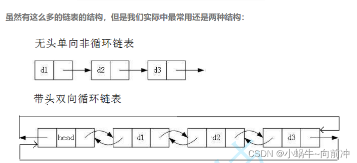 1. 无头单向非循环链表:结构简单,一般不会单独用来存数据。实际中更多是作为其他数据结构的子结构,如哈希桶、图的邻接表等等。另外这种结构在笔试面试中出现很多。