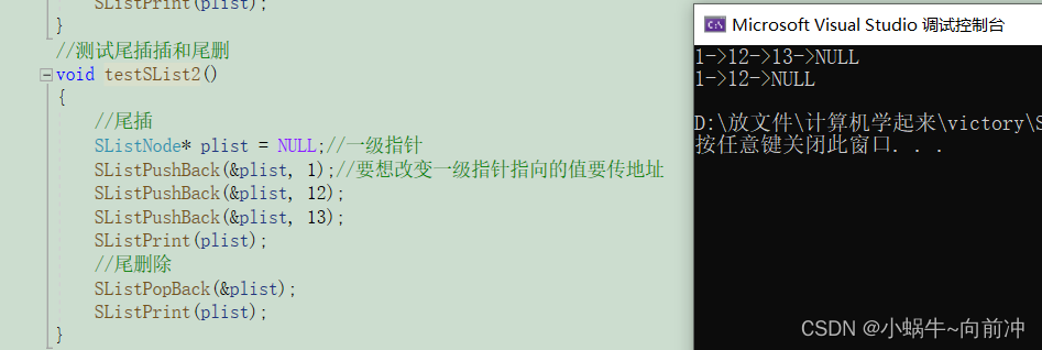 单链表的尾删的话条件更加复杂一点,我们要考虑链表为空就不删除,链表中为一个节点(不要尾)和链表中多个节点(要找尾)。