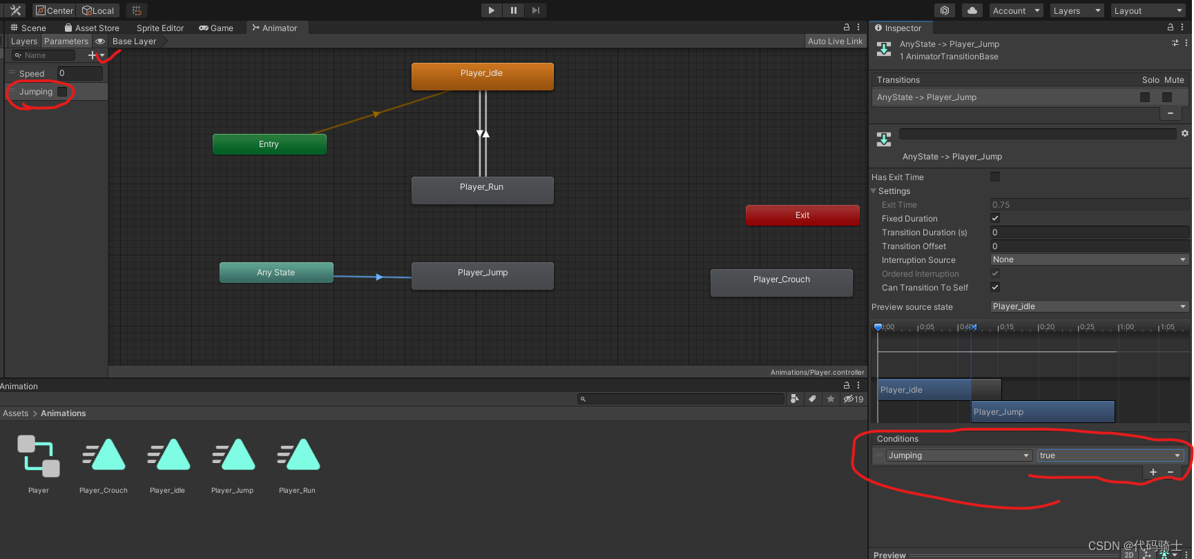 设置布尔类型的jumping参数,当jumping为真时,开始播放跳跃动画