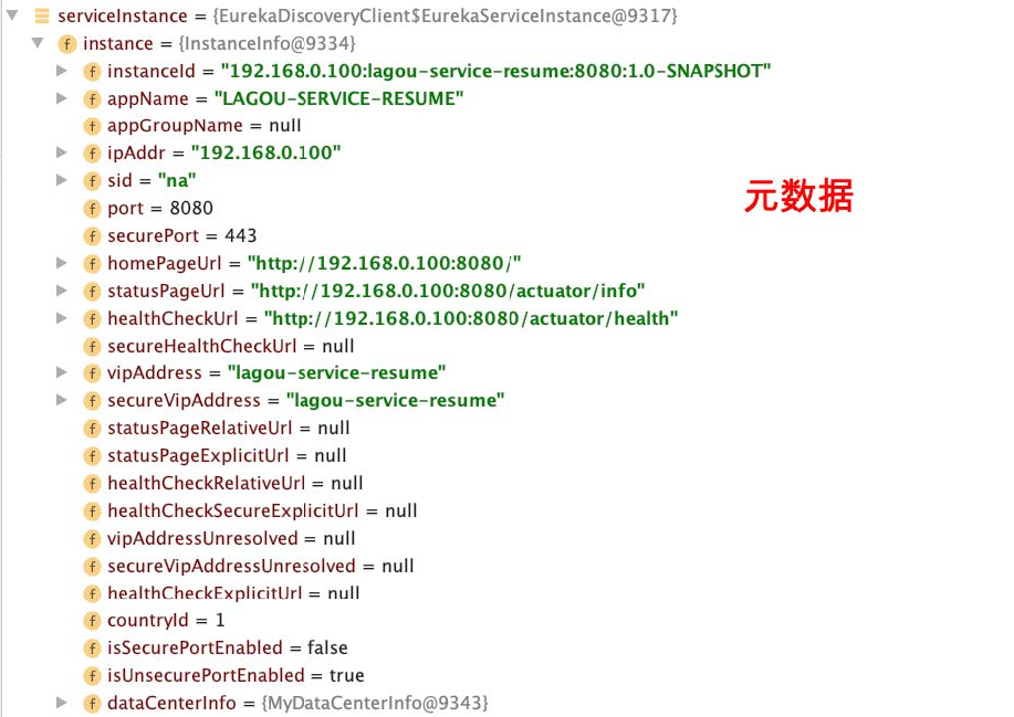 instances = discoveryClient.getInstances("lagou-service-resume"); - // 循环打印每个微服务实例的元数据信息