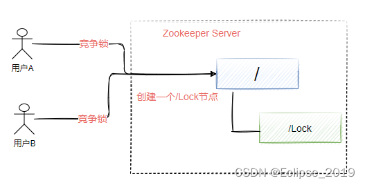 就是基于唯一节点特性,如下图所示。多个应用程序去抢占锁资源时,只需要在指定节点上创建一个 /Lock 节点,由于Zookeeper中节点的唯一性特性,使得只会有一个用户成功创建 /Lock 节点,剩下没有创建成功的用户表示竞争锁失败。
