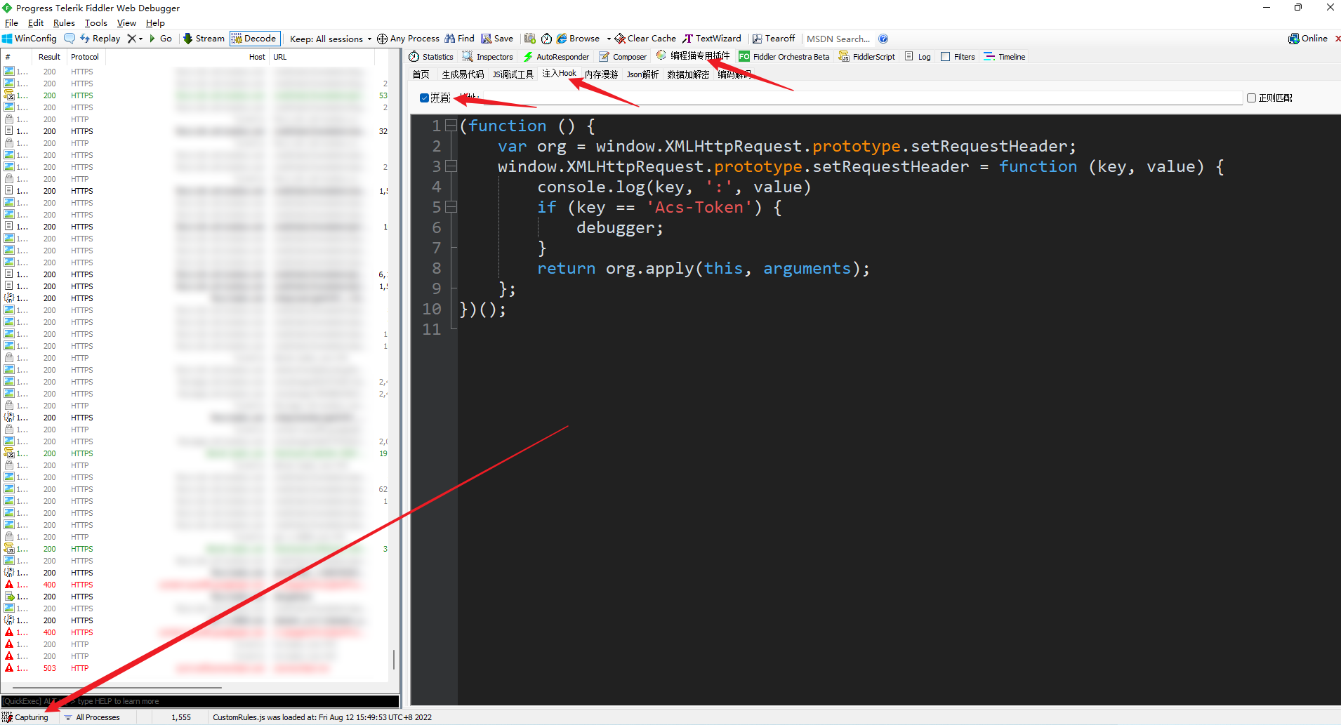 这里使用 Fiddler 插件 hook 定位 Acs-Token 参数,相关 hook 操作方式可阅读 K 哥往期文章,本文不再赘述: