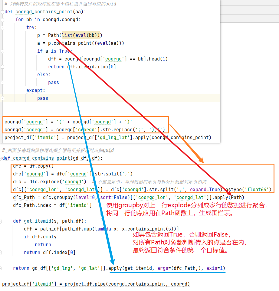 coorgd_contains_point:这个函数主要功能是判断传入的点是否在一组点圈住的范围内,coorgd['coorgd']中每一行值为组成一个围栏表的点。在原函数中每次判断点时都会为每一行重新生成围栏表,无疑增加了计算耗时,并且用eval函数转换字符串为python列表对象是消耗内存和时间的,由此,这部分的代码优化则是减少eval的使用,和每次判断点是否在某个围栏表中,只需要生成一次围栏表对象。
