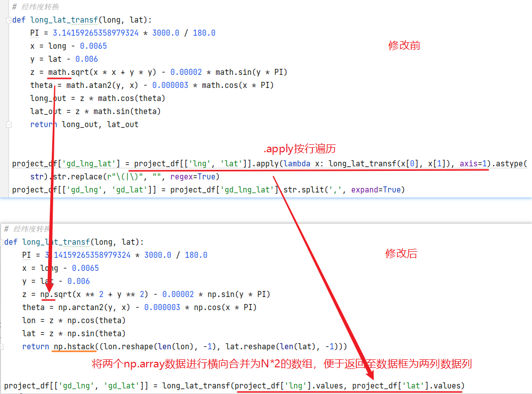 函数long_lat_transf及调用方式更改对比如下:
