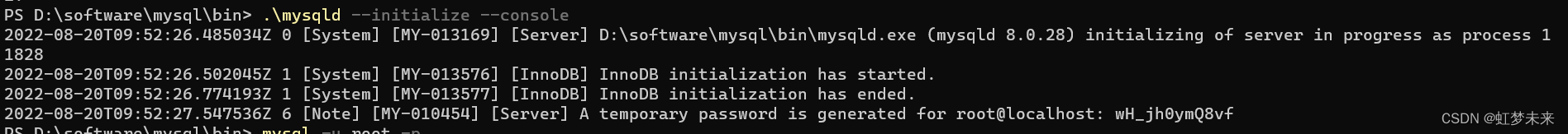 注意上边的命令,不包含创建mysql数据存放路径,需要手动创建,或者命令指定数据路径(--datadir=D:/mysqldata)